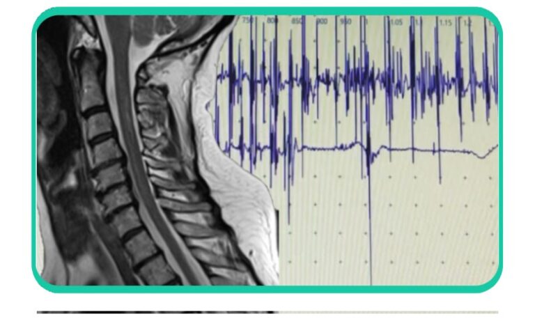 Imagine: RMN – mielita cervicala, hernii de disc C3-C4, C4-C5, C5-C6; EMG – traseu dintr-un muschi care a pierdut fibre nervoase (denervare) si a creat noi conexiuni din fibrele ramase viabile (denervare)